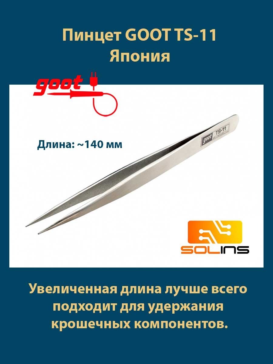 Пинцет GOOT TS-11 тонкий, удлинен антимагнитный Япония (Пинцет прямой Goot TS-11 длинный из нержавеющей стали, острый, тонкий, антимагнитный, для пайки, ремонта, рукоделия и мелких работ, Япония)