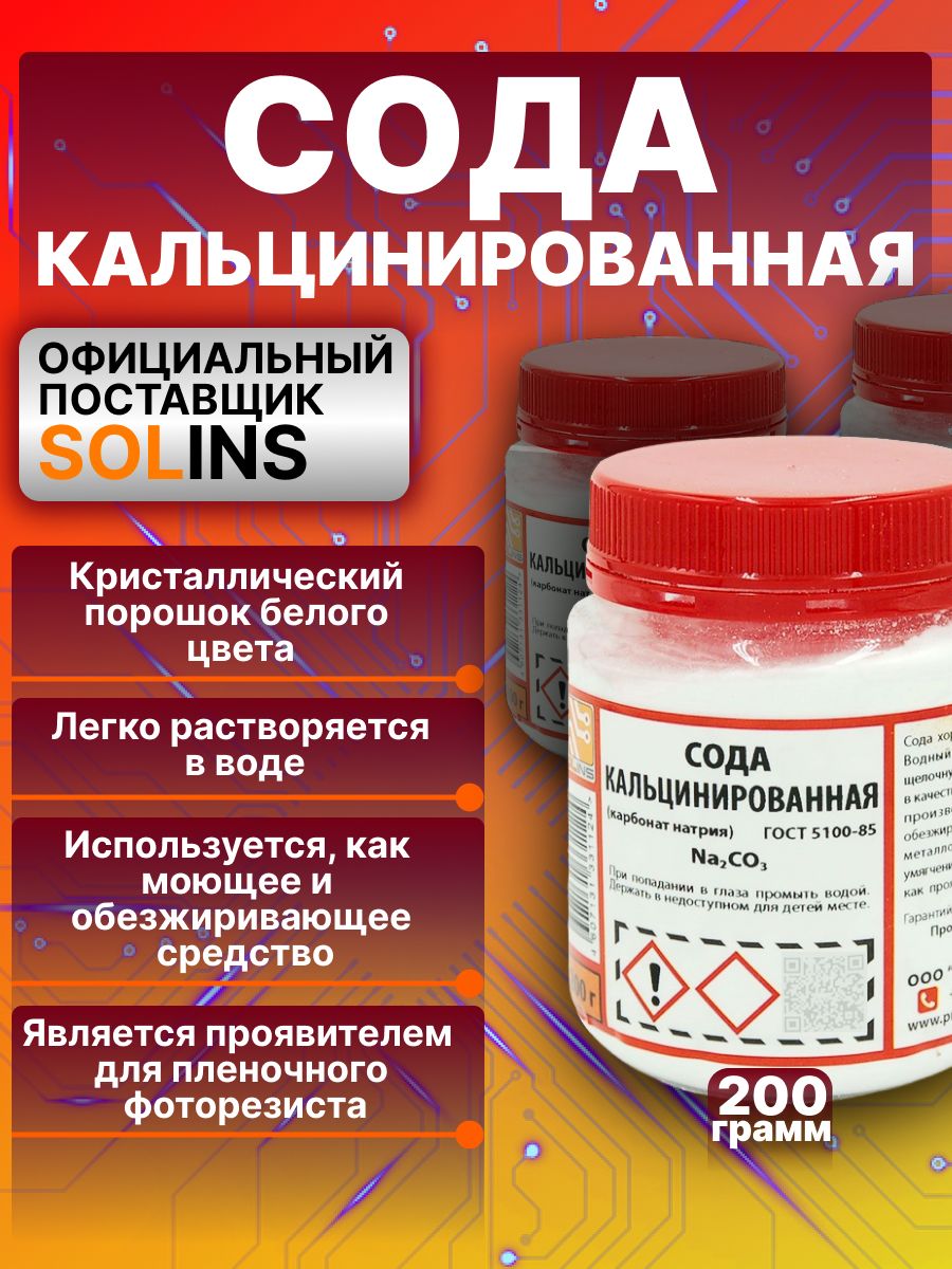 Сода кальцинированная (карбонат натрия) SOLINS Na2CO3, кристаллический порошок, белый, 200 г (1шт)